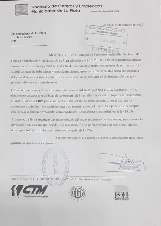 Solicitamos la urgente convocatoria de la mesa paritaria salarial a fin de lograr una recomposición salarial para todas las trabajadoras y trabajadores dependientes de la municipalidad como consecuencia del grave deterioro salarial, los insuficientes acuerdos que se han dado en el corriente año y el grave proceso inflacionario que padecemos.