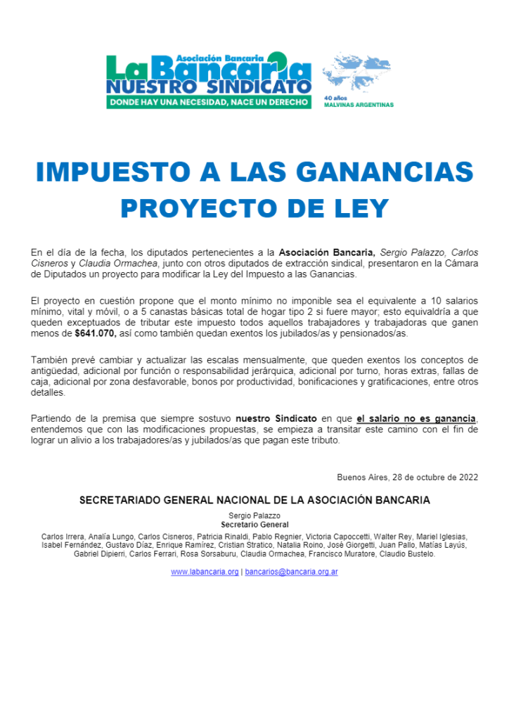 En el día de la fecha, los diputados pertenecientes a la Asociación Bancaria, Sergio Palazzo, Carlos Cisneros y Claudia Ormachea, junto con otros diputados de extracción sindical, presentaron en la Cámara de Diputados un proyecto para modificar la Ley del Impuesto a las Ganancias.