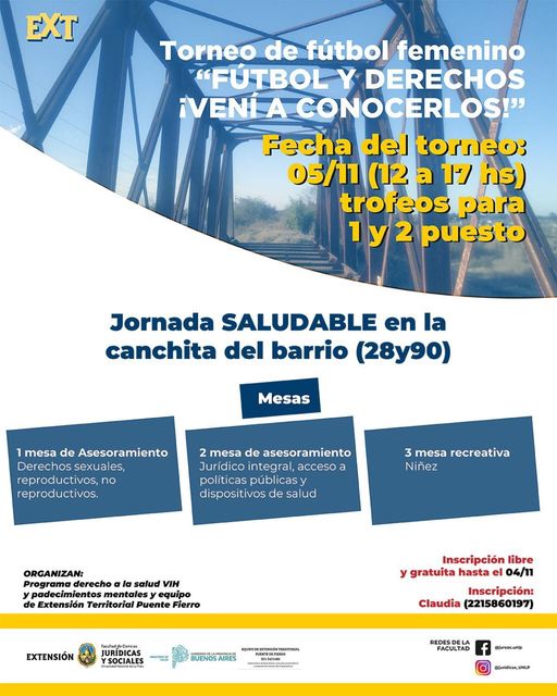 El Programa Derecho a la salud VIH y padecimientos mentales dependiente de la Secretaría de Extensión junto con el equipo de Extensión Territorial Puente Fierro y el Ministerio de Salud de la Provincia de Buenos Aires invita a participar de la “Jornada Saludable”, la cual se llevará a cabo el día sábado 5 de noviembre del corriente año, desde las 12 a las 17hs en la “canchita del barrio” (28y90).