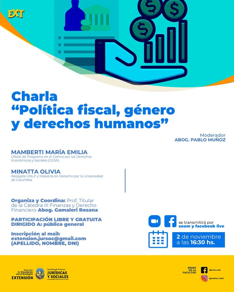 La Secretaría de Extensión Universitaria invita a participar de la Charla “Política fiscal, género y derechos humanos”, la cual se llevará a cabo el día miércoles 2 de noviembre del corriente año a las 16:30 hs, a través de la plataforma zoom.