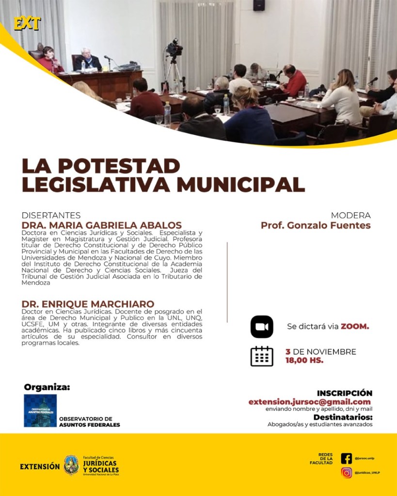 La Secretaría de Extensión invita a participar de la Jornada “La Potestad Legislativa Municipal” , organizada por el Observatorio de Asuntos Federales , la cual se llevará a cabo el día jueves 3 de noviembre a las 18 hs, a través de la plataforma ZOOM.