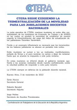 La Junta Ejecutiva de la CTERA mantuvo reuniones en estos días con autoridades de los Ministerios de Economía, de Trabajo y de ANSES; en las cuales se planteó la necesidad de establecer de manera urgente la trimestralización del pago del índice de actualización de las Jubilaciones Docentes Nacionales.