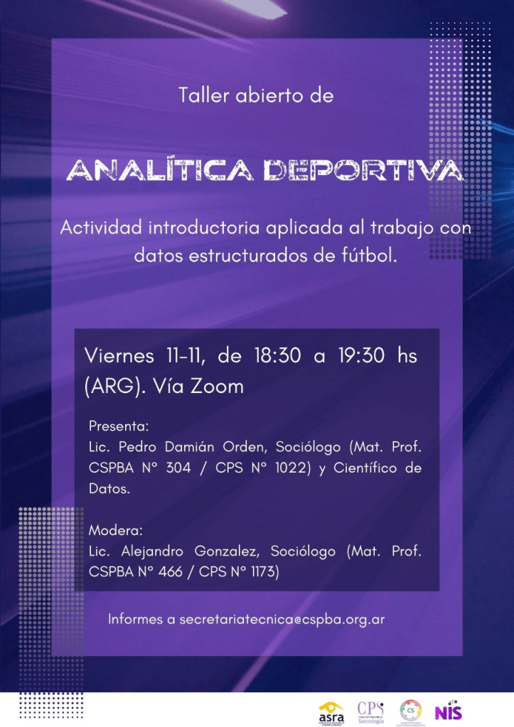 En el marco de un nuevo taller abierto de programación en vivo, el día viernes 11 de noviembre entre las 18:30 y 19:30 hs (Hora argentina) llevaremos adelante vía streaming una experiencia de trabajo en vivo con datos deportivos.