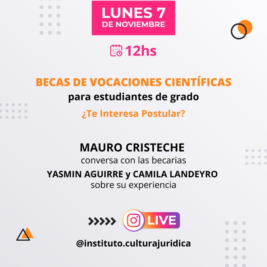 La Secretaria de Investigación Científica invita a participar de la charla sobre «Becas de Vocaciones Científicas para estudiantes de grado» que se realizará el lunes 7 de noviembre a las 12hs, por Instagram Live en la cual participarán el Dr. Mauro Cristeche y las Becarias Yasmín Aguirre y Camila Landeyro. Esta actividad es organizada por el Instituto de Cultura Jurídica.