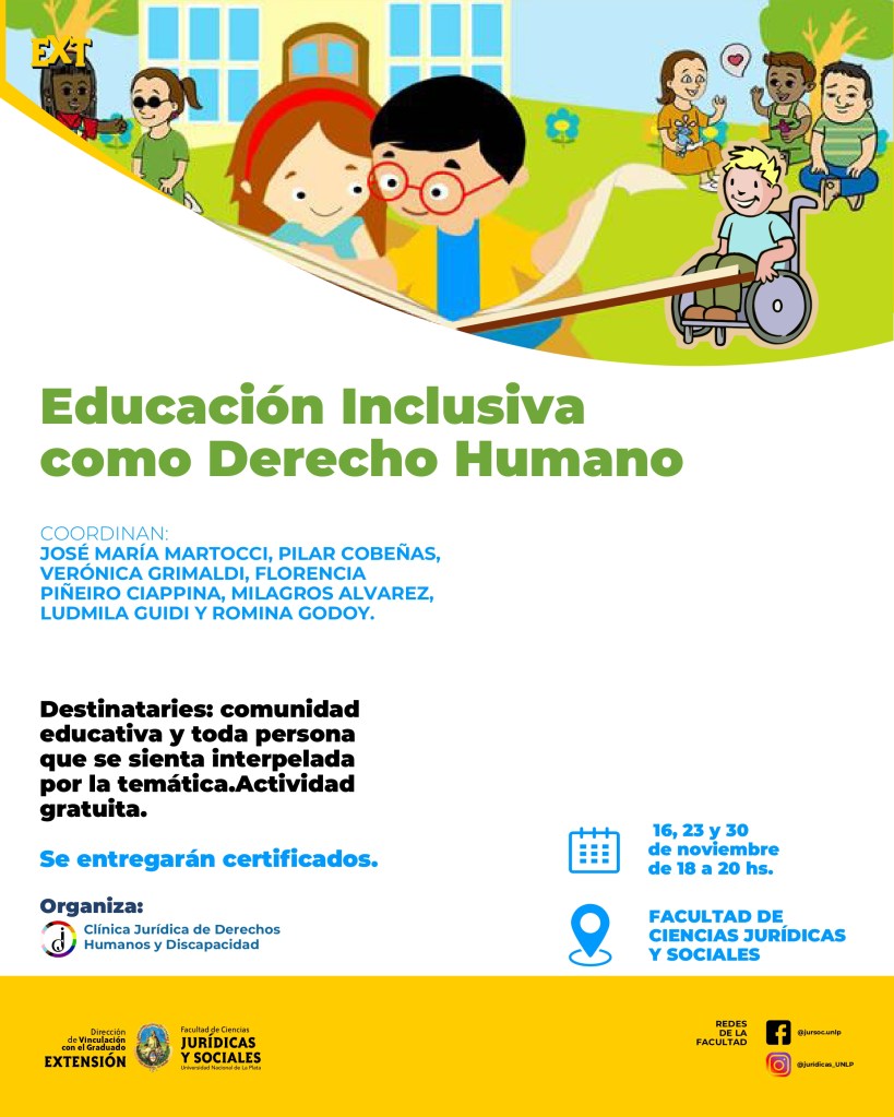 La Secretaría de Extensión invita a participar de la jornada «EDUCACIÓN INCLUSIVA COMO DERECHO HUMANO» . La actividad propone un espacio de conversación en torno a la Educación Inclusiva desde su perspectiva pedagógica y un enfoque de Derechos Humanos. La misma se llevará a cabo en tres jornadas (16, 23 y 30 de noviembre) y será con modalidad presencial en la Facultad de Ciencias Jurídicas y Sociales.