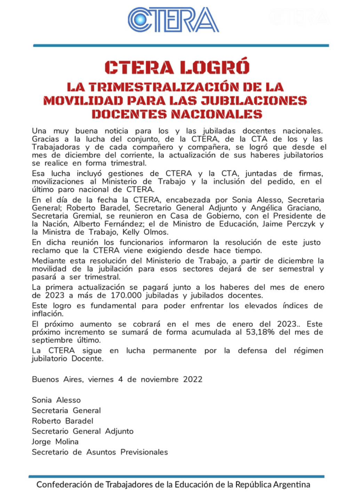 CTERA LOGRÓ LA TRIMESTRALIZACIÓN DE LA MOVILIDAD PARA LAS JUBILACIONES DOCENTES NACIONALES