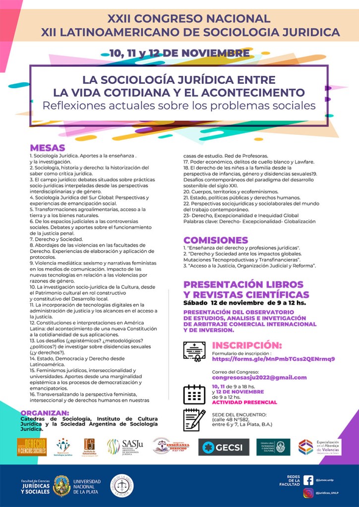 Reflexiones actuales sobre problemas sociales» y se celebrará los días 10, 11 y 12 de noviembre de 2022 en la Facultad de Ciencias Jurídicas y Sociales de la UNLP, ciudad de La Plata, Bs. As., Argentina.