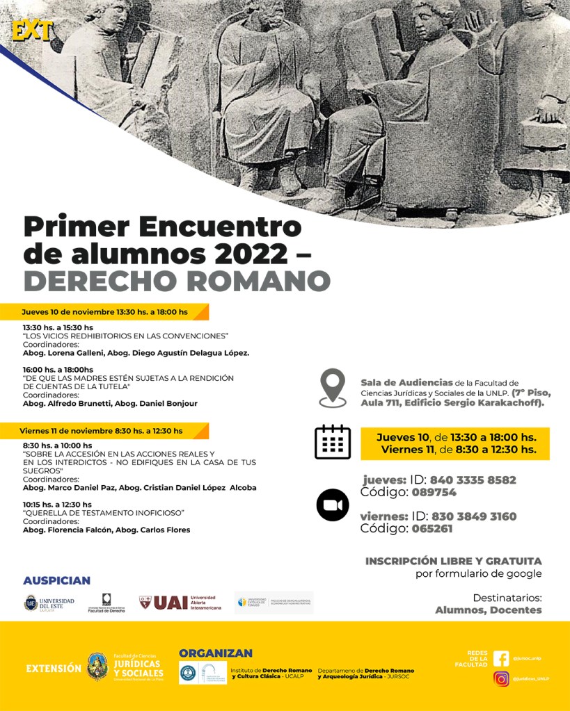 La Secretaría de Extensión invita a participar del “Primer Encuentro de alumnos 2022 – Derecho Romano”, organizado por el Departamento de Derecho Romano y Arqueología Jurídica, de la Facultad de Ciencias Jurídicas y Sociales de la Universidad Nacional de La Plata y, el Instituto de Derecho Romano y Cultura Clásica, de la Universidad Católica de La Plata.