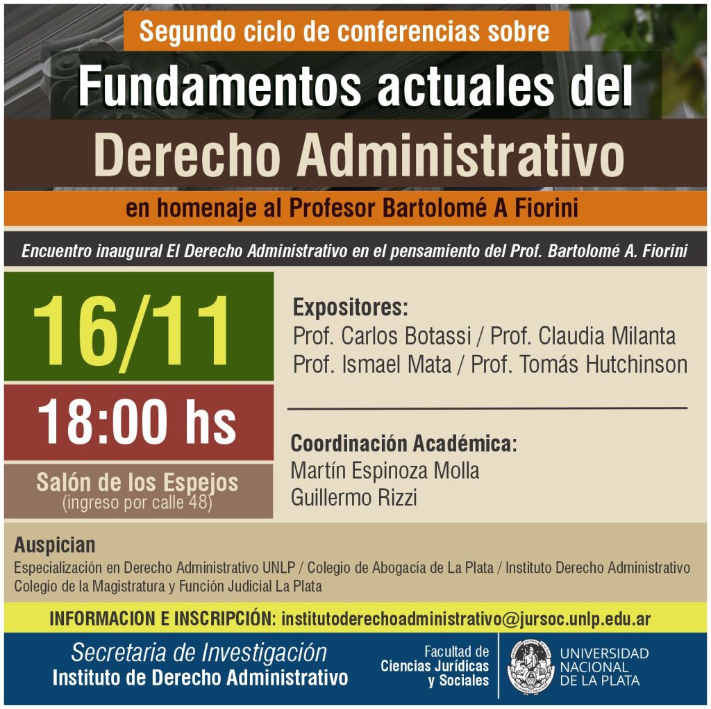 La Secretaría de Investigación Científica de la Facultad de Ciencias Jurídicas y Sociales, tiene el agrado de invitar a participar en el Segundo Ciclo de Conferencias sobre Fundamentos Actuales del Derecho administrativo, en homenaje al Profesor Bartolomé A Fiorini, organizado por el Instituto de Derecho Administrativo de esta Facultad.
