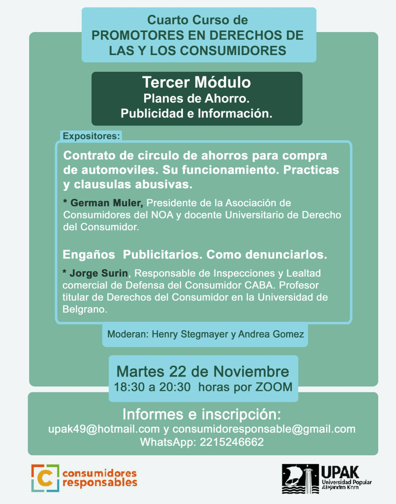 Inscripción e informes upak49@hotmail.com y consumidoresponsable@gmail.com o al Whatsapp +54 9 221 524-6662.