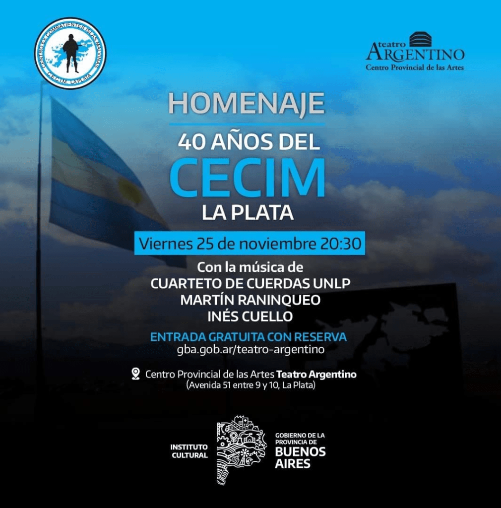 El Instituto Cultural de la Provincia de Buenos Aires realizará un homenaje al Centro de Ex Combatientes de Islas Malvinas (CECIM) de la Plata en sus 40 años de existencia. La cita tendrá lugar el viernes 25 de noviembre a las 20:30 en el Foyer del 1° Piso del Centro Provincial de las Artes Teatro Argentino de La Plata (calle 51 entre 9 y 10).