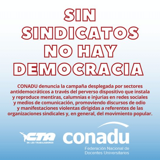 La Federación Nacional de Docentes Universitarios CONADU denuncia la campaña desplegada por sectores antidemocráticos a través del perverso dispositivo que instala y reproduce mentiras, calumnias e injurias en redes sociales y medios de comunicación, promoviendo discursos de odio y manifestaciones violentas dirigidas a referentes de las organizaciones sindicales y, en general, del movimiento popular.