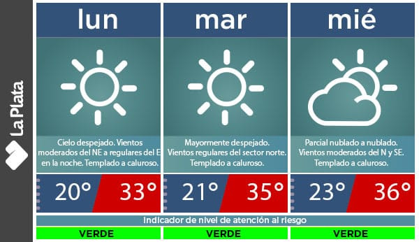 De acuerdo a los datos aportados por la Dirección de Hidrometeorología local, “durante los próximos días habrá buenas condiciones de tiempo, con nubosidad en aumento, mañanas templadas y tardes calurosas”. Asimismo, se prevén máximas que rondarán entre los 33º y 36º, se anticipó.