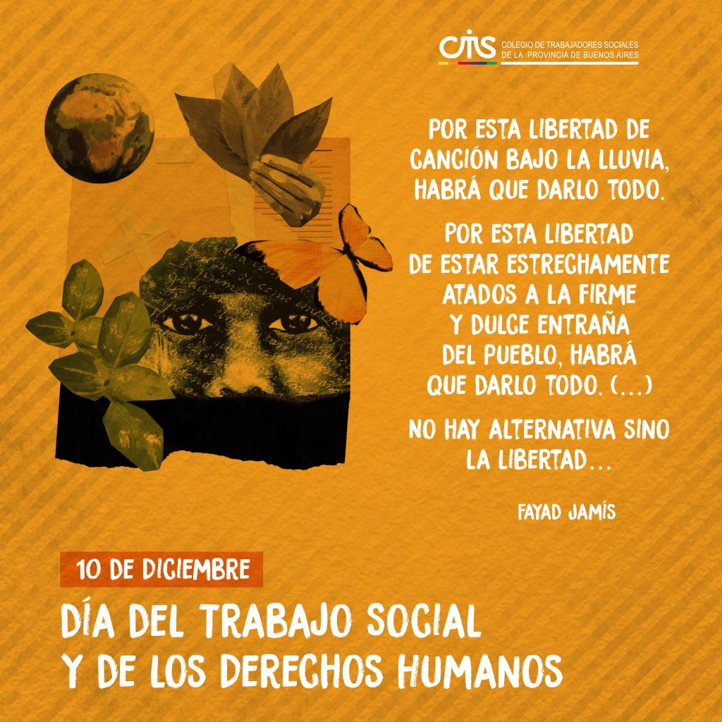 Desde el año 2012 en Argentina el día del Trabajo Social coincide con el Día Internacional de los Derechos Humanos, como así también con el aniversario del retorno a la democracia en nuestro país, cumpliéndose este año el 39° aniversario de la asunción de Raúl Ricardo Alfonsín en la presidencia nacional. Ubicar a nuestra profesión en dichos procesos históricos no constituye una cuestión menor, sino que materializa una interpelación permanente por la apuesta de un proyecto profesional comprometido con la defensa de valores inherentes a la libertad, la igualdad, la democracia y la justicia.
