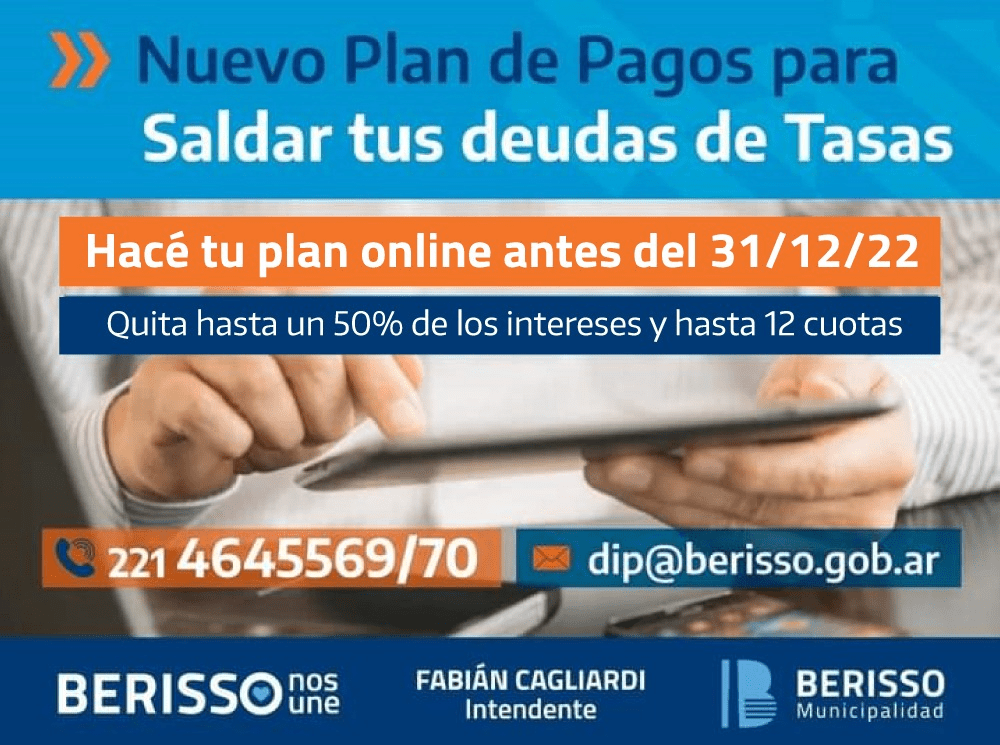 La Municipalidad de Berisso lanzó un nuevo plan de pagos que permite regularizar deudas de tasas con una quita del 50 % de los intereses y a abonar en hasta 12 cuotas.