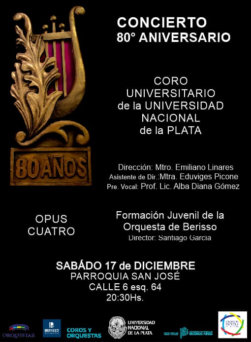 En el marco de los festejos por su 80º aniversario, y bajo la dirección de su flamante Director, Maestro Emiliano Linares, el Coro Universitario de la Universidad Nacional de La Plata ofrecerá su concierto de fin de año. El mismo será el próximo sábado 17 de diciembre en la Iglesia San José, ubicada en calle 6 esquina 64, a las 20:30 horas. Estarán como invitados la Formación Juvenil de la Orquesta Escuela de Berisso y el Grupo Vocal Opus Cuatro. La entrada es libre y gratuita.
