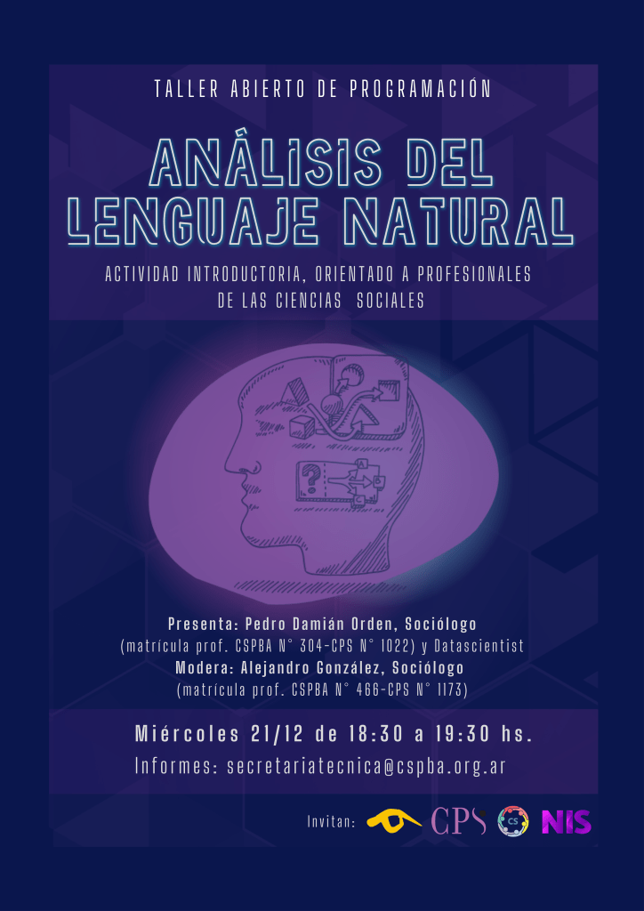 Tenemos el agrado de invitarles este miércoles 21 de diciembre, entre las 18:30 y las 19:30 hs., al último taller abierto del año, orientado a introducir conocimientos base sobre el Análisis de Lenguaje Natural (NLP), un campo especializado de las ciencias de la computación, la ingeniería y la inteligencia artificial enraizado en la lingüística computacional que comienza a ser utilizado por sociólogos y sociólogas.