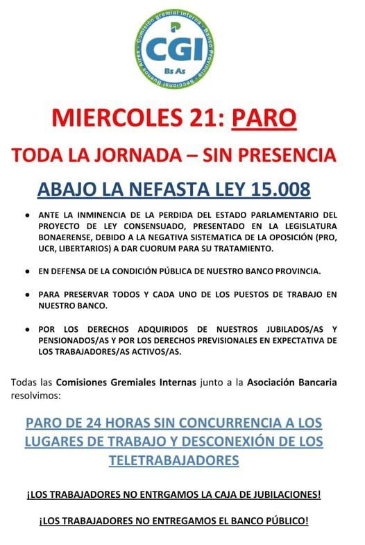 Hace exactamente 5 años se sancionó en el más sórdido secreto la maldita ley 15008, que fue y es enfrentada por la heroica resistencia de todos los empleados y empleadas del Banco de la Provincia de Buenos Aires, sus jubilados y jubiladas con nuestro sindicato LA BANCARIA al frente.