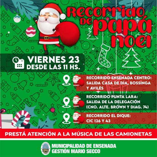 Mañana, viernes 23 de diciembre a partir de las 11hs., llega la esperada recorrida de Papa Noel por las calles de la ciudad de Ensenada. Como todos los años, se visitarán los distintos barrios para que los niños y niñas puedan recibir golosinas en la previa de la Nochebuena. Se solicita prestar atención a la música que acompañarán a Papa Noel ya que marcará su llegada.