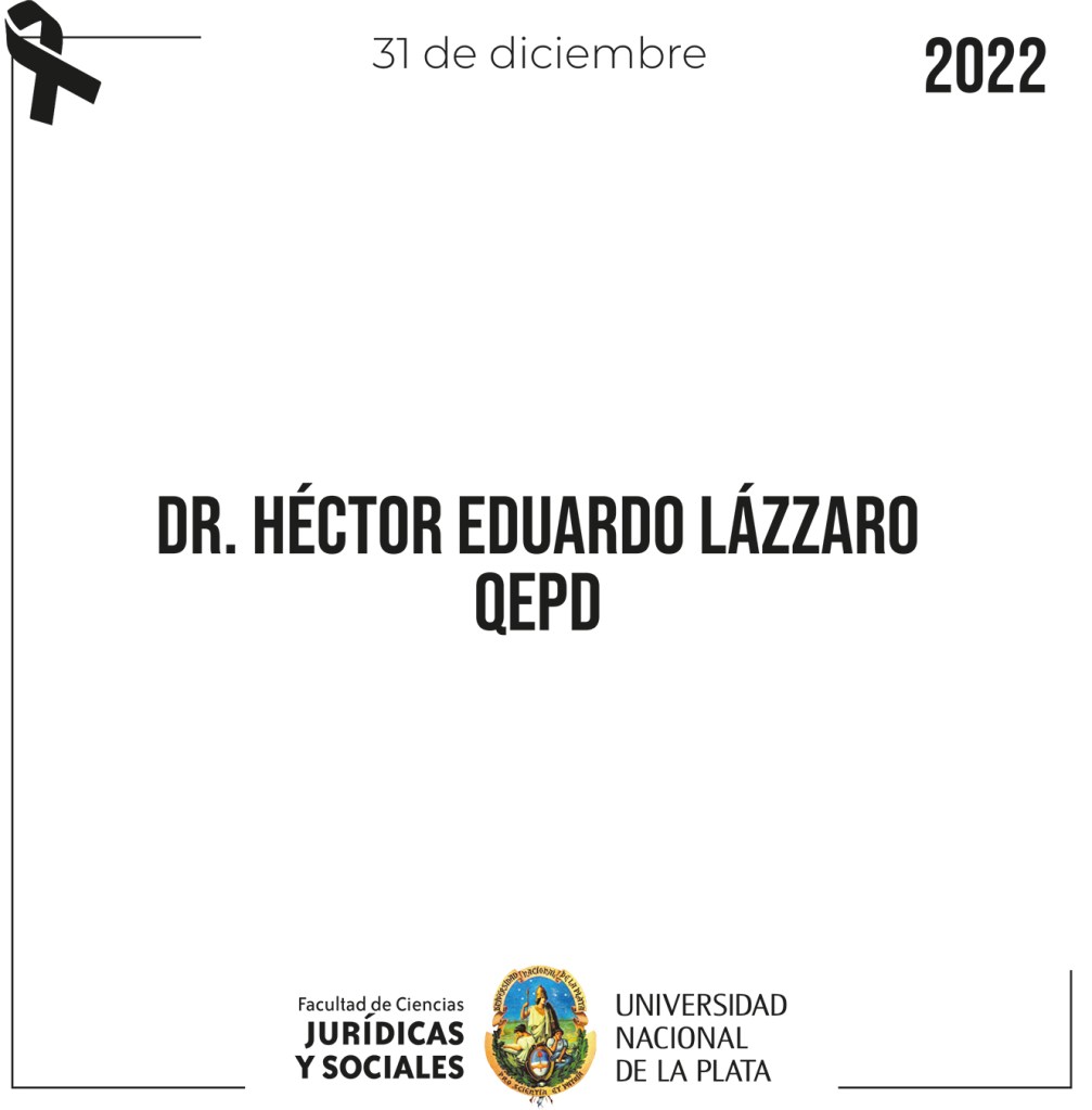 Con profundo dolor la Facultad de Ciencias Jurídicas y Sociales de la Universidad Nacional de La Plata despide al Profesor Extraordinario Consulto Dr. Héctor Eduardo LÁZZARO y hace llegar las condolencias a sus familiares y amigos.
