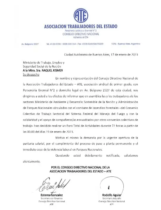 Ante la falta de respuestas, en asamblea, lxs trabajadores de los sectores Ministerio de Ambiente y Desarrollo Sostenible de la Nación, y de Administración de Parques Nacionales vinculados con el combate de incendios forestales, definieron realizar un paro total de actividades por 72 horas, a partir de 19 de enero del corriente.