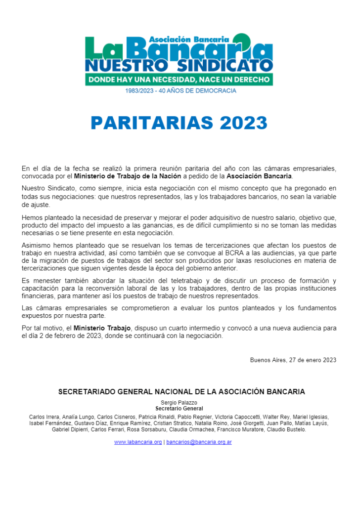 En el día de la fecha se realizó la primera reunión paritaria del año con las cámaras empresariales, convocada por el Ministerio de Trabajo de la Nación a pedido de la Asociación Bancaria.