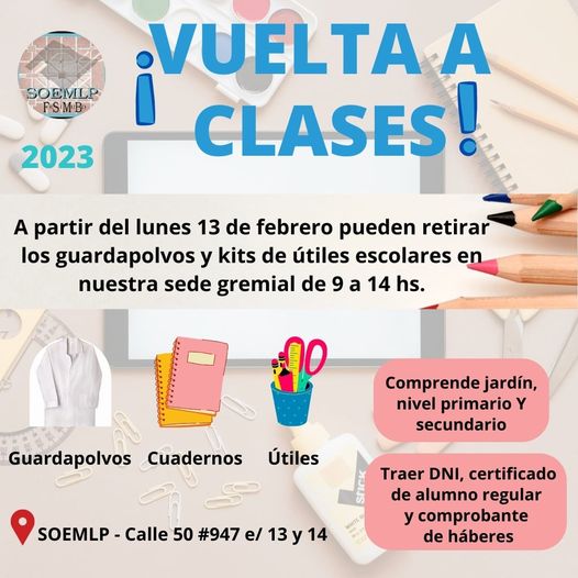 A partir del lunes 13 de febrero estaremos entregando guardapolvos y útiles escolares de 9 a 14 hs.