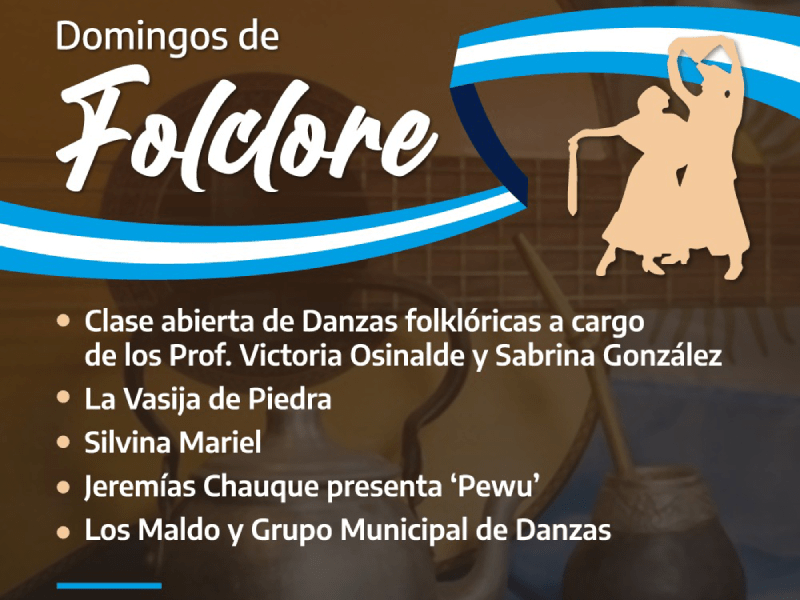 En esta ocasión, el domingo 12, desde las 18:00 horas los y las asistentes podrán compartir una clase abierta de Danzas folclóricas a cargo de las Prof. Victoria Osinalde y Sabrina González; la Vasija de Piedra; Silvina Mariel; Jeremías Chauque presenta «Pewu» y Los Maldo y el Grupo Municipal de Danzas.