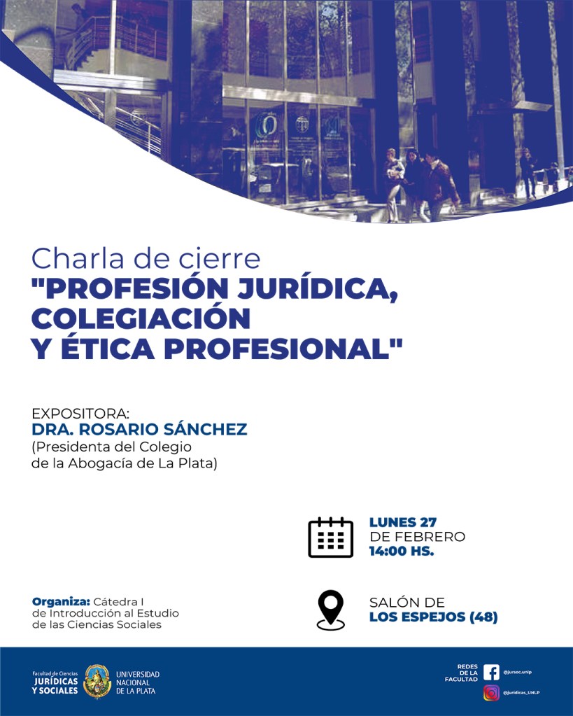 La Facultad de Ciencias Jurídicas y Sociales invita a participar de la Charla de cierre: «Profesión jurídica, colegiación y ética profesional», la cual se llevará a cabo de manera presencial el lunes 27 de febrero a las 14:00 hs. en el Salón de los Espejos (Edificio de la Reforma).