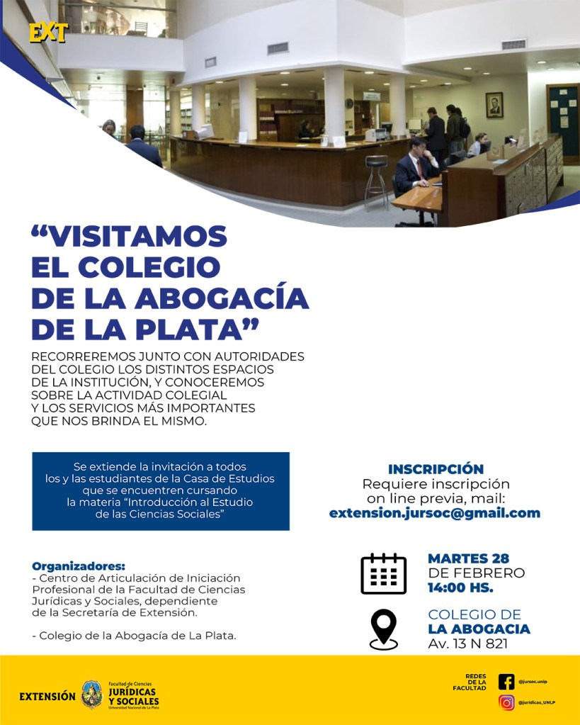 Desde el Centro de Articulación de Iniciación Profesional de la Facultad de Ciencias Jurídicas y Sociales, dependiente de la Secretaría de Extensión, en coordinación con el Colegio de la Abogacía de La Plata (CALP), invitamos a los/as alumnos/as de esta Casa de Estudios que se encuentren cursando la materia “Introducción al Estudio de las Ciencias Sociales” a realizar una visita al Colegio de la Abogacía de La Plata, el día martes 28 de febrero de 2023 a las 14 hs. En esta oportunidad, recorreremos junto con autoridades del Colegio los distintos espacios de la institución, y conoceremos sobre la actividad colegial y los servicios más importantes que nos brinda el mismo.