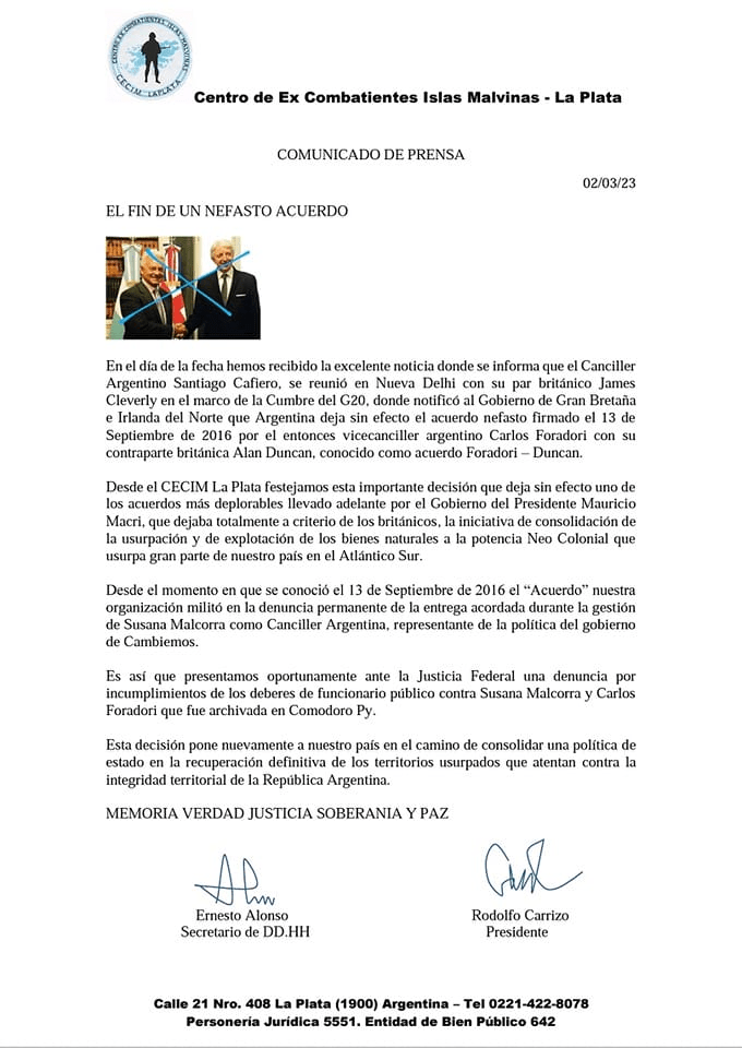 2 marzo, 20232 marzo, 2023 clipurbanodenoticias El CECIM La Plata volvió a reclamar el fin del acuerdo Foradori-Duncan /Fuente: Centro de Ex Combatientes de Islas Malvinas La Plata/ Fin al Nefasto Acuerdo!!! Comparte esto: Compartir en X (Se abre en una ventana nueva) X Comparte en Facebook (Se abre en una ventana nueva) Facebook Más Compartir en LinkedIn (Se abre en una ventana nueva) LinkedIn Compartir en Tumblr (Se abre en una ventana nueva) Tumblr Haz clic en Pinterest (Se abre en una ventana nueva) Pinterest Compartir en Telegram (Se abre en una ventana nueva) Telegram Compartir en WhatsApp (Se abre en una ventana nueva) WhatsApp Me gusta Cargando...