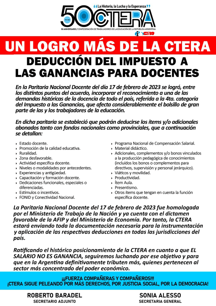 UN LOGRO MÁS DE LA CTERA: DEDUCCIÓN DEL IMPUESTO A LAS GANANCIAS PARA DOCENTE