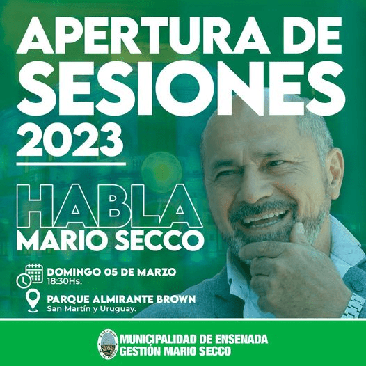 El Intendente Mario Secco encabezará la apertura de sesiones 2023 el domingo 05 de marzo a las 18:30 hs. en el Parque Almirante Brown.