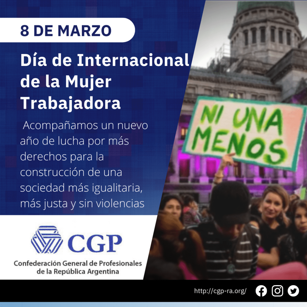 En el Día Internacional de la Mujer Trabajadora, desde la Confederación General de Profesionales de la República Argentina, acompañamos su lucha y saludamos especialmente a aquellas profesionales que forman parte de nuestra organización.