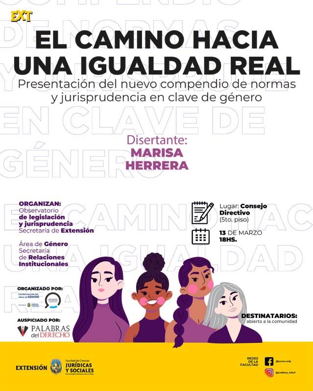 La Secretaría de Extensión Universitaria invita a participar de la Jornada “El camino hacia una igualdad real”, organizada por el Observatorio de Legislación y Jurisprudencia dependiente de esta Secretaría juntamente con el Área de Género de la Secretaría de Relaciones Institucionales, la cual se llevará a cabo el día lunes 13 de marzo a las 18 hs., en el Salón Consejo Directivo (5° piso), Edificio de la Reforma.