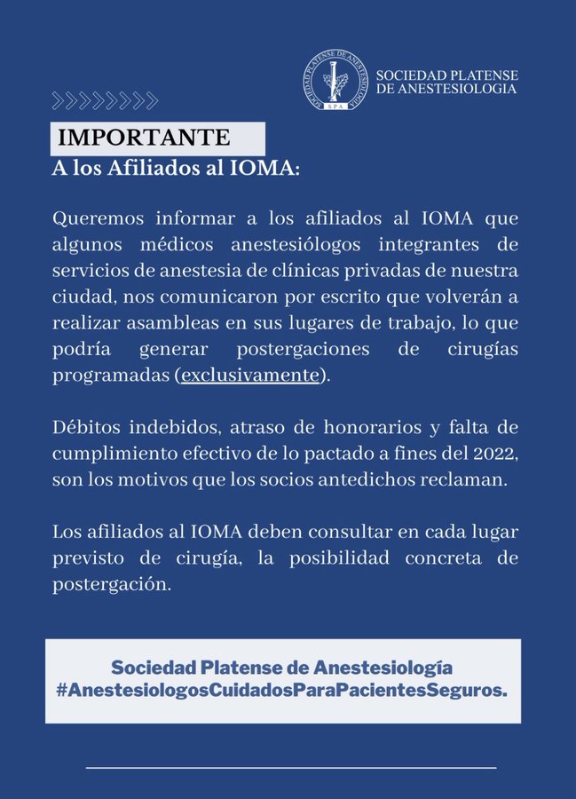 Anestesiólogos de La Plata continúan con asambleas y prevén la postergación de cirugías programadas a afiliados de IOMA
