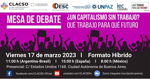 Les invitamos a participar de la charla debate «¿Un capitalismo sin trabajo? Qué trabajo para qué futuro», que será llevada a cabo por Clacso – Consejo Latinoamericano de Ciencias Sociales, Observatorio DESC, IESCODE-UNPAZ y Iec Conadu.