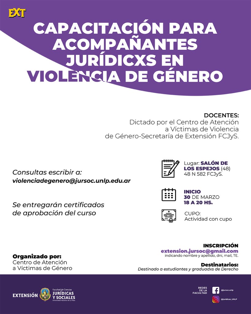 La Secretaría de Extensión Universitaria invita a participar de la CAPACITACIÓN PARA ACOMPAÑANTES JURÍDICXS EN VIOLENCIA DE GÉNERO organizada por El Centro de Atención a Víctimas de Violencia de Género dependiente de la Secretaría de extensión FCJyS