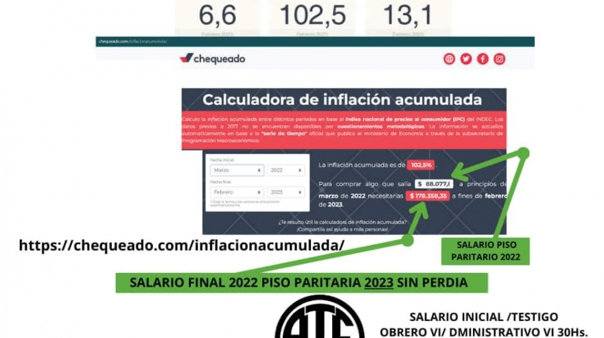 Tal como lo viene planteando nuestra organizacion sindical en las diferentes instancias de negociación paritaria y conocidas las nuevas mediciones de organismos oficiales (INDEC -la rem bcra) que informan un acumulado del 102.5%, solicitamos resolver el salario final 2022 sin perdida fijando también un piso de discusión paritaria 2023 no a la baja, la reparación de la pérdida del poder adquisitivo de las y los trabajadores municipales en esta instancia de revisión es fundamental.