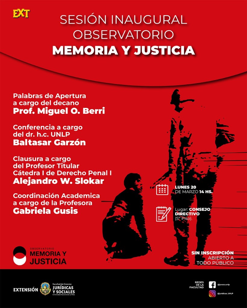 La Secretaría de Extensión Universitaria invita a participar de la «Sesión Inaugural del Observatorio Memoria y Justicia», dependiente de esta secretaría, dicha sesión tendrá lugar el próximo lunes 20 de marzo a las 14 hs. en el Salón del Consejo Directivo, (5° piso, Edificio de la Reforma).