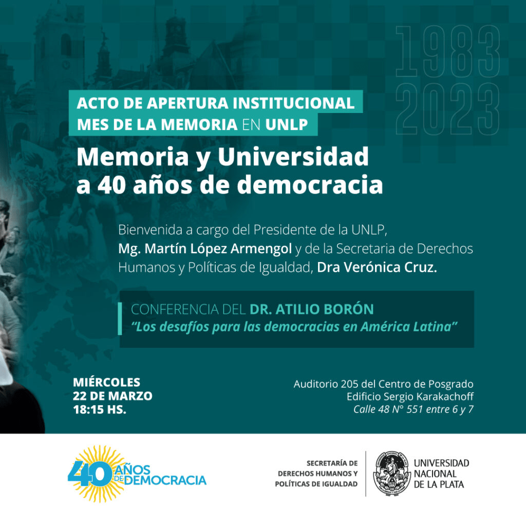 Cabe señalar que, bajo el lema “Memoria y Universidad, a 40 años de Democracia”, durante todo el mes se desarrollarán actividades en las diferentes facultades y dependencias de la UNLP.