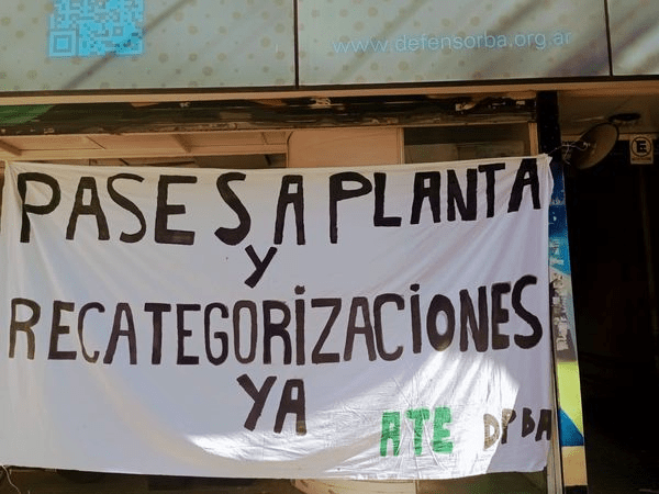Las y los trabajadores de la Defensoría del Pueblo de la provincia de Buenos Aires se concentraron en la puerta de la institución para visibilizar sus reclamos y solicitar la implementación en el organismo de las recategorizaciones acordadas en las negociaciones paritarias, así como pedir el pase a planta de los trabajadores precarizados.
