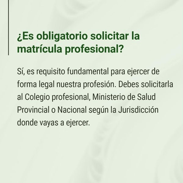 La matriculación ante la autoridad de control en cada jurisdicción (Colegio Profesional, Ministerio Provincial o Ministerio de Salud de la Nación en la Ciudad de Buenos Aires) constituye un requisito obligatorio para ejercer la profesión en el marco de la legalidad.