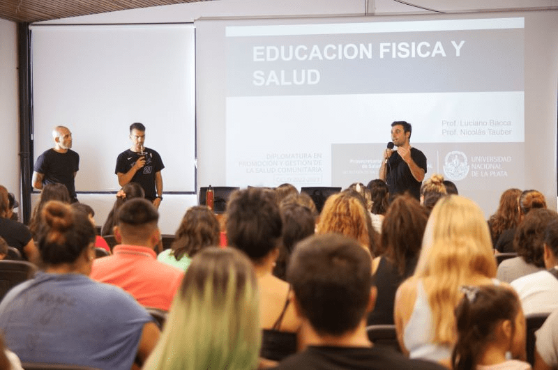 En el marco de la Diplomatura en Promoción y Gestión de la Salud Comunitaria dictada por la Universidad Nacional de La Plata se desarrolló un taller de educacion fisica y salud. El mismo contò con la presencia del prosecretario de Salud de la UNLP, Manuel Fonseca y estuvo dictado por los profesores de Educacion Fisica Luciano Bacca y Nicolas Tauber, ambos egresados de la Facultad de Humanidades y Ciencias de la Educacion de la UNLP.