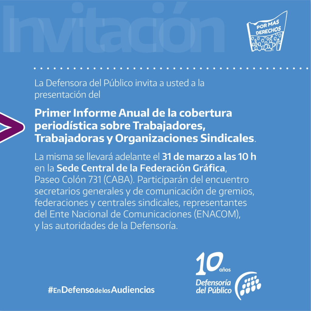 La Defensoría del Público invita a la Presentación del Primer Informe Anual sobre la cobertura periodística para un tratamiento responsable sobre Trabajadores, Trabajadoras y Organizaciones Sindicales