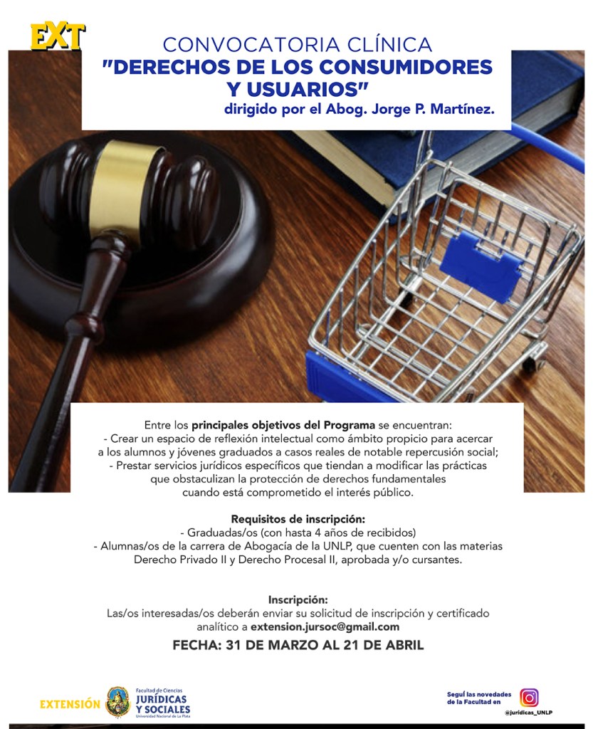 La Secretaría de Extensión Universitaria de la Facultad de Ciencias Jurídicas y Sociales abre la inscripción de aspirantes a formar parte de la Comisión de «Derechos de los Consumidores y Usuarios» del Programa Clínicas Jurídicas, dirigido por el Abog. Jorge P. Martínez.