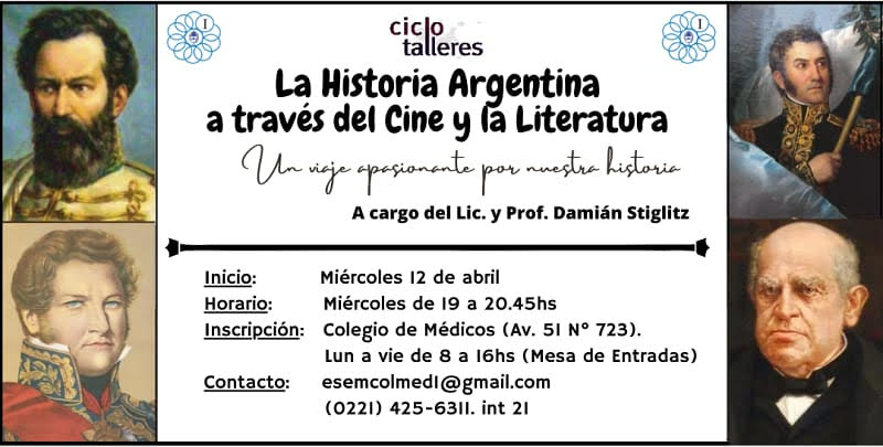 El Colegio de Médicos de la Provincia de Buenos Aires, Distrito I, informa a sus matriculados que el día 12 de abril a las 19 hs, iniciará el Ciclo Taller “La Historia Argentina a través del Cine y la Literatura.”