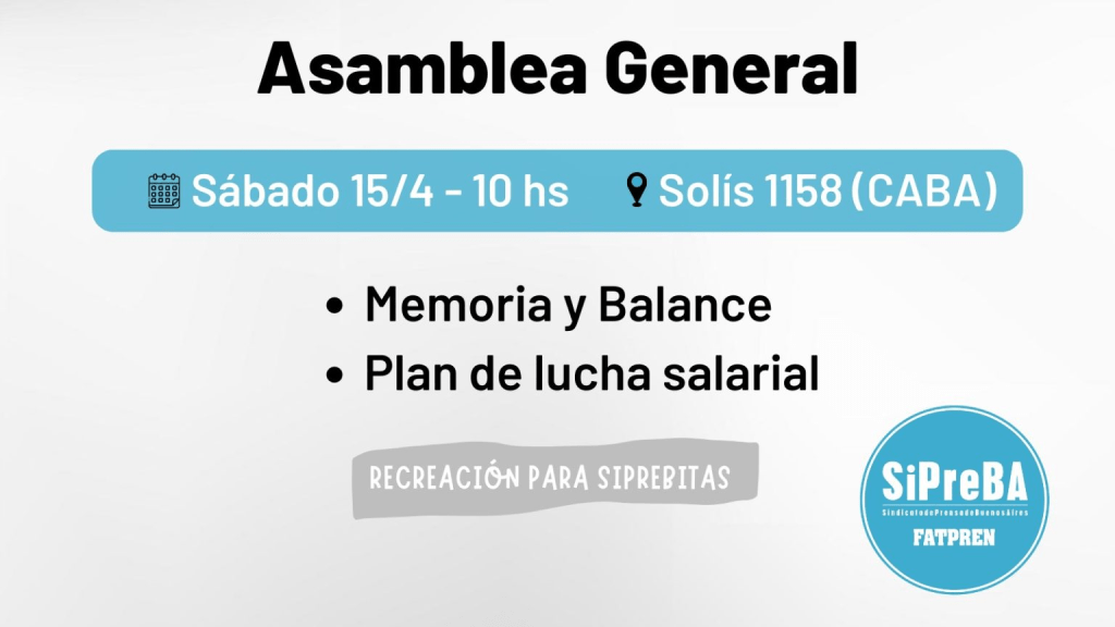 Desde el SiPreBA convocamos a les afiliades el sábado 15/4, a las 10 hs, en el 1° piso de nuestra sede (Solís 1158, CABA) a participar de la Asamblea General.