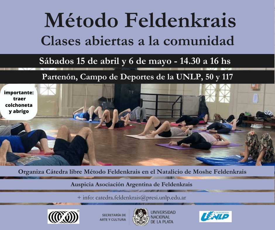 La Universidad Nacional de La Plata llevará a cabo clases abiertas a la comunidad del Método de Feldenkrais. Las mismas se desarrollarán los sábados 15 de abril y 6 de mayo de 14.30 a 16 hs en el Partenón del Campo de Deportes de la UNLP, ubicado en calle 50 y 117.