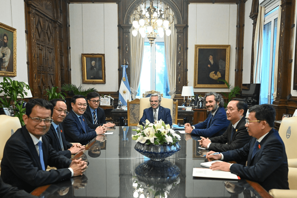 El presidente Alberto Fernández mantuvo hoy un encuentro con el presidente de la Asamblea Nacional de la República Socialista de Vietnam, Vuong Dinh Hue, con quien reafirmó el interés mutuo de ampliar la relación comercial bilateral y el flujo de inversiones.